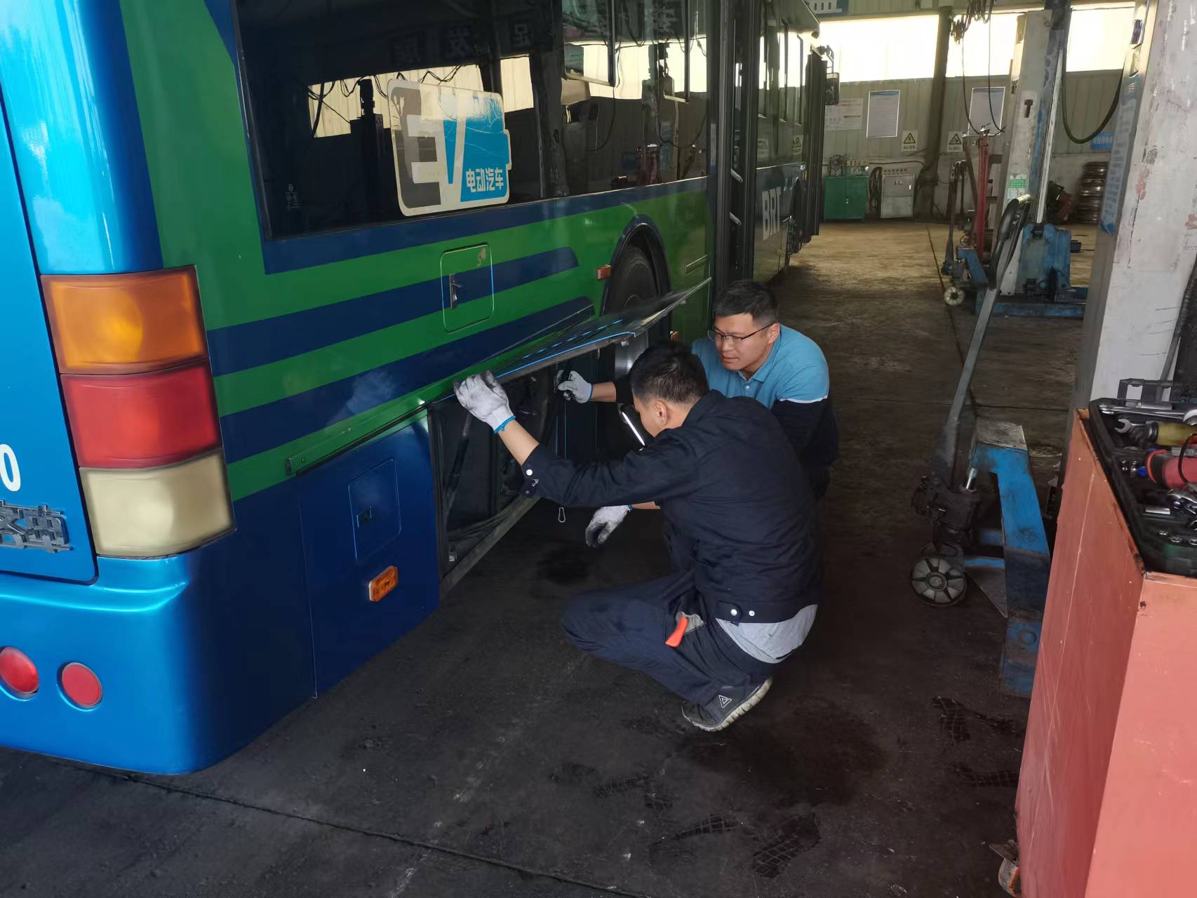 此次檢查工作由機務技術(shù)事業(yè)部大浦分廠技術(shù)專員張強帶隊,組織“張強工作室”成員開展作業(yè),前期對成員們進行了專項檢查動員培訓,在作業(yè)現(xiàn)場,張強對檢查作業(yè)項目進行指導,主要針對電池、高壓控制柜、驅(qū)動電機、轉(zhuǎn)向系統(tǒng)、空壓機、空調(diào)、高壓線束等高壓部件進行專項的全面檢查,另外對例保檢查不到位的地方進行排查。