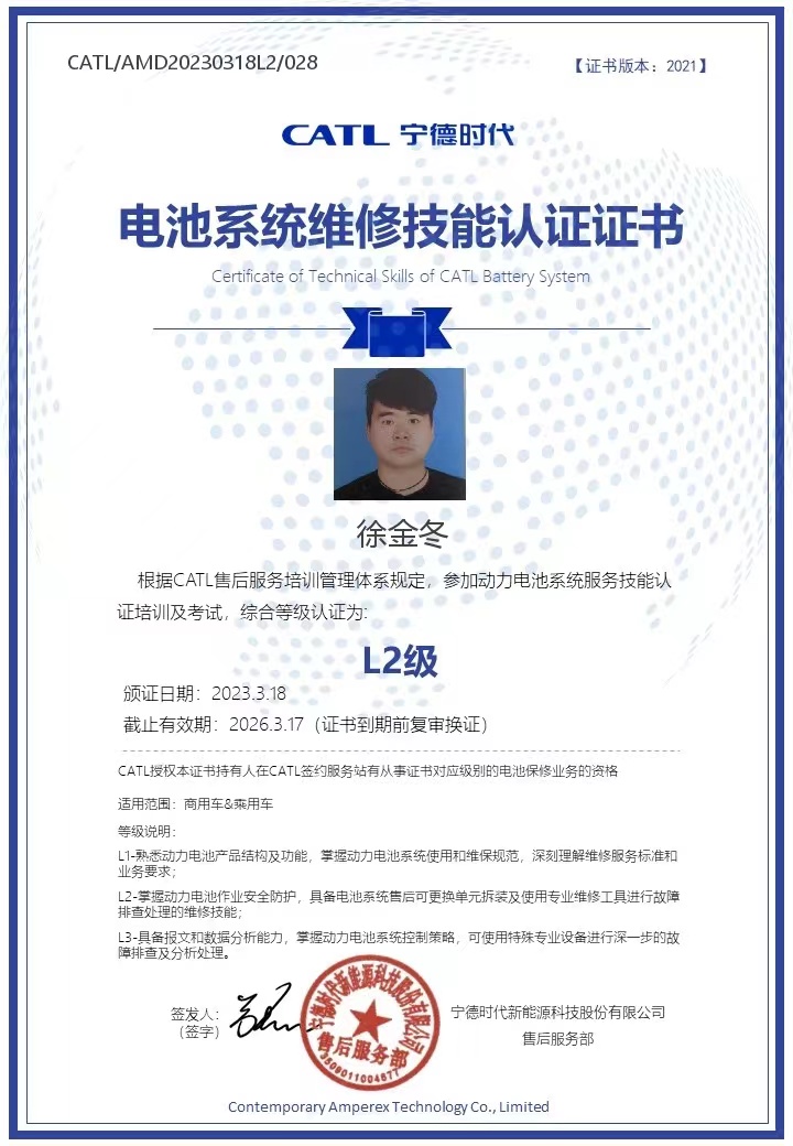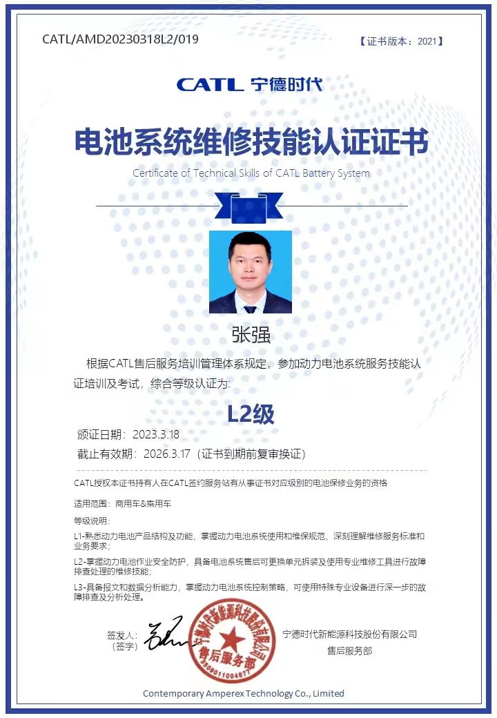 此次培訓(xùn)選派張強(qiáng)、徐金冬兩名一線維修人員參加寧德時(shí)代在武漢舉辦的《鋰動力電池》L2-A培訓(xùn),培訓(xùn)分為理論和實(shí)操,理論課內(nèi)容涉及認(rèn)識商用車電池系統(tǒng)、電池均衡;實(shí)操課涵蓋了商用車上位機(jī)使用、安全作業(yè)防護(hù)與基本維修流程、充放電作業(yè)、商用車電池箱深度拆裝等重點(diǎn)內(nèi)容,參培人員利用5天的時(shí)間,參加培訓(xùn)的人員認(rèn)真學(xué)習(xí),在實(shí)操訓(xùn)練中逐步熟悉和掌握電池拆裝及使用專業(yè)維修工具進(jìn)行故障排查處理的維修技能,最終通過理論、實(shí)操考核工作,獲得了寧德時(shí)代頒發(fā)的L2級維修技能等級證書。