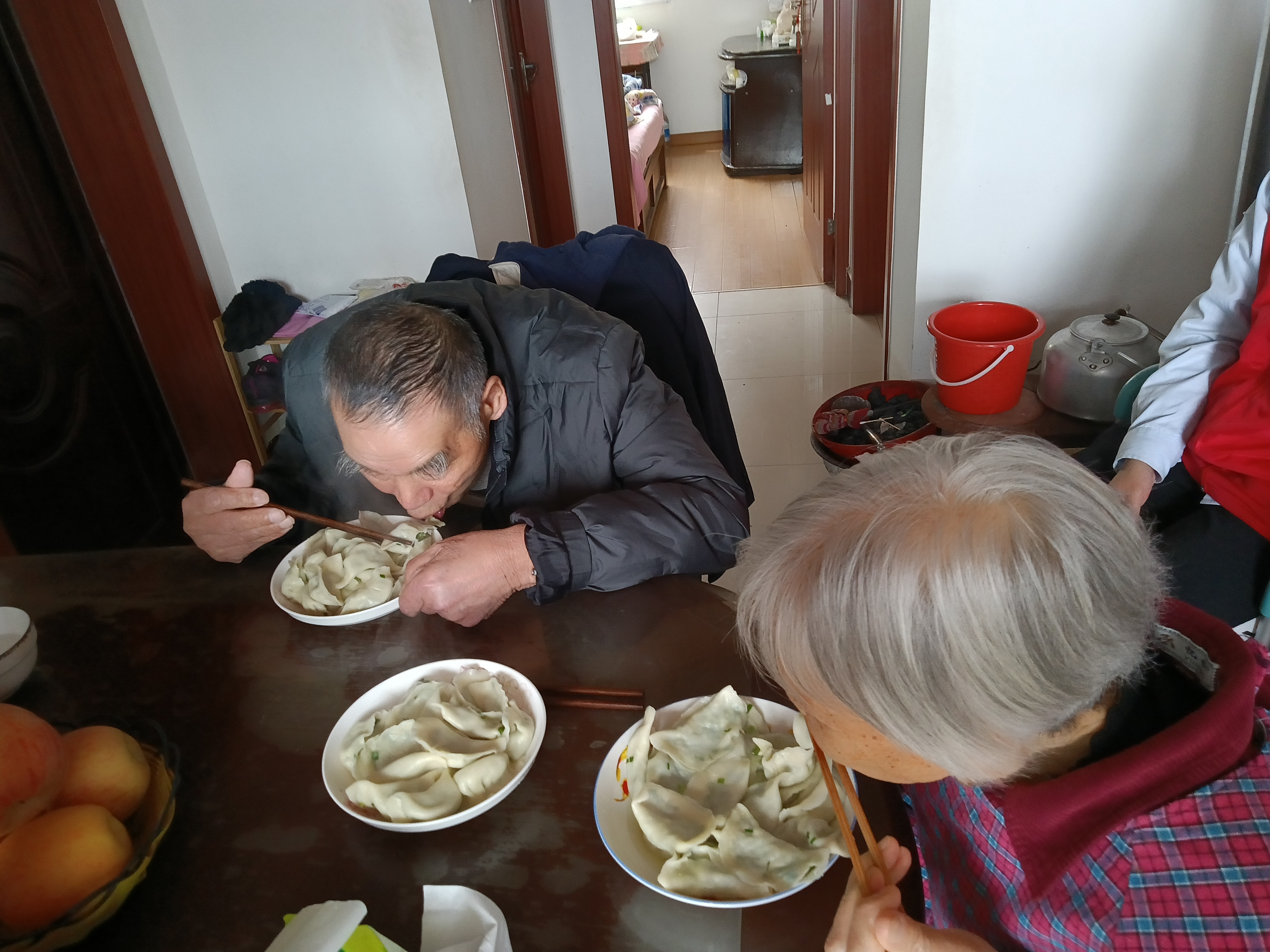 志愿者們來到掌阿姨家里,干勁十足,有的擦桌掃地拖地,有的理菜洗菜拌餡,有的和面揉面包餃子。兩個小時后,屋里衛(wèi)生收拾干凈了,韭菜蝦仁肉餡餃子也煮好了。掌阿姨看著桌上熱騰騰的餃子,再看看煥然一新的家,激動地說:“今天又麻煩你們了,感謝閨女們,你們也坐下來一起吃吧!”老人一邊說一邊將志愿者往桌邊拉。