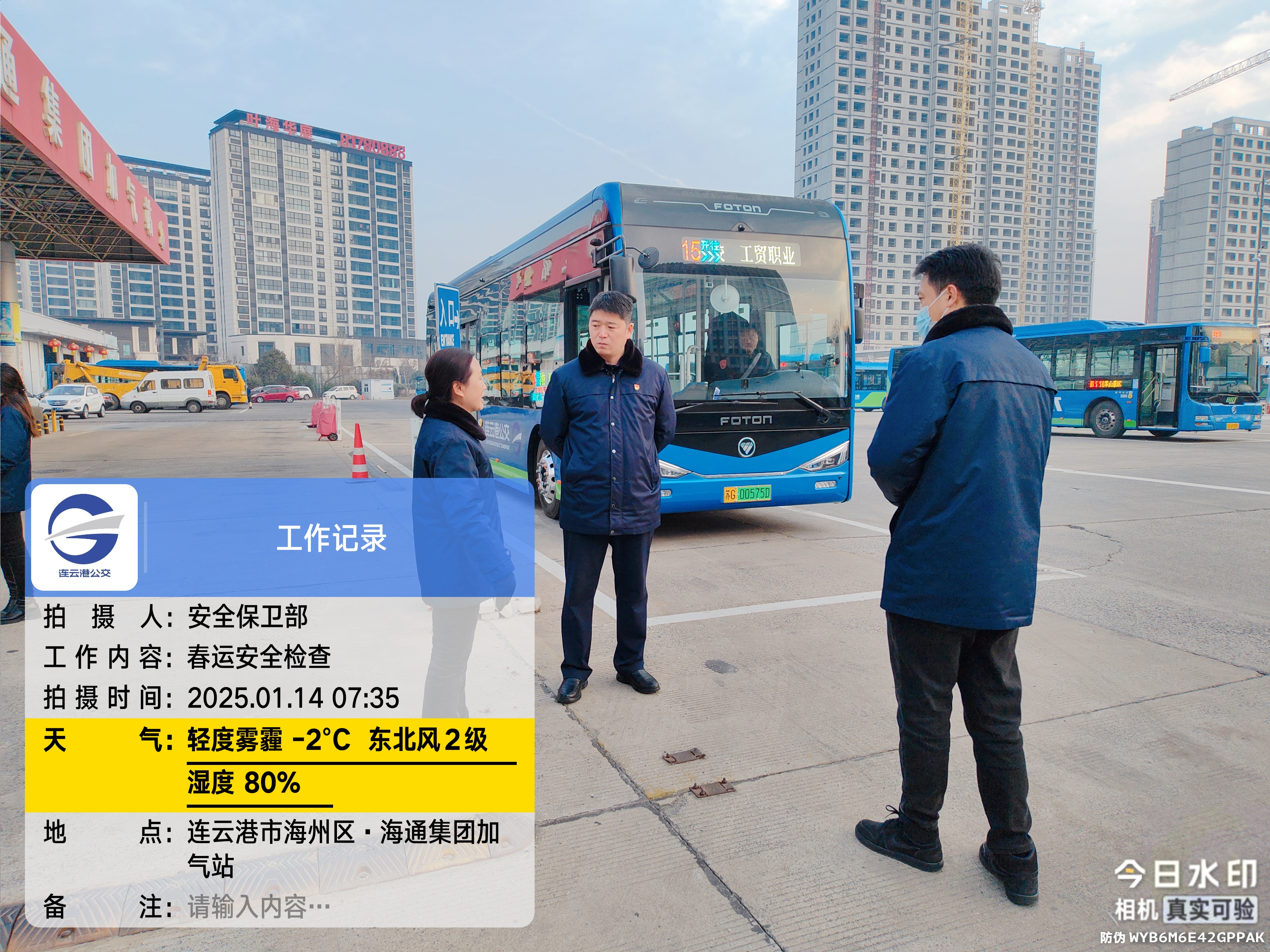 1 月 14 日春運首日,公交集團黨委書記、總經(jīng)理王學兵及領導班子成員、相關部室成員組成春運檢查組深入一線,開展安全生產(chǎn)大檢查,確保春運期間市民出行安全。此次檢查是對集團 2025 年度春運動員大會精神的有力踐行,旨在為廣大市民的出行安全保駕護航。