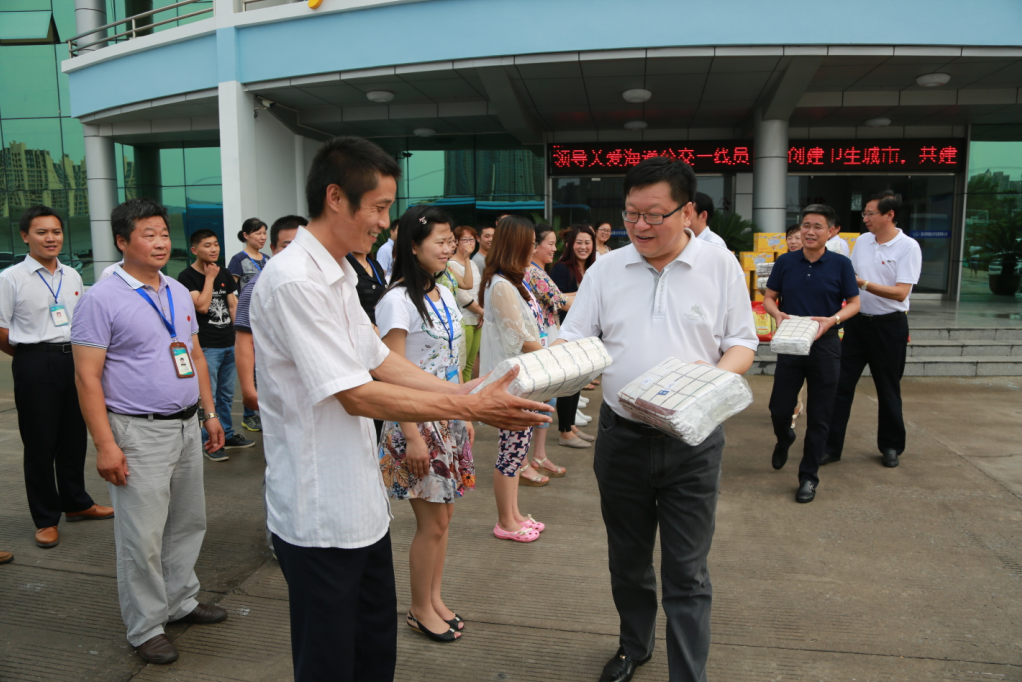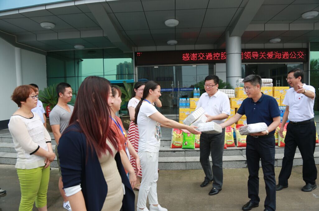 7月26日下午,交通控股集團(tuán)黨委書記、董事長(zhǎng)劉永能,黨委副書記、總經(jīng)理仲偉濤,工會(huì)主席王中永等集團(tuán)領(lǐng)導(dǎo)冒著高溫來(lái)到海通公交公司,親切看望慰問(wèn)了高溫下堅(jiān)守崗位的公交一線員工,為他們送去綠豆、白糖、純凈水、飲料等防暑降溫物品,并叮囑他們注意防暑降溫,以良好的狀態(tài)投入到工作中去,做好安全服務(wù)工作,服務(wù)好廣大乘客。劉永能等領(lǐng)導(dǎo)叮囑隨行的公交公司領(lǐng)導(dǎo),一定要關(guān)心員工的身心健康,尤其要做好夏季的防暑降溫工作,把“送清涼、送安全、送法律”活動(dòng)落到實(shí)處,讓廣大員工真正感受到組織的關(guān)愛。