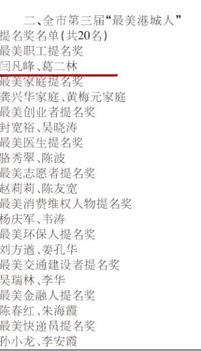 為貫徹落實(shí)中辦《關(guān)于培育和踐行社會(huì)主義核心價(jià)值觀的意見》精神,在全社會(huì)大力培育和踐行社會(huì)主義核心價(jià)值觀,弘揚(yáng)主旋律,傳播正能量,為加快建設(shè)“一帶一路”交匯點(diǎn)核心區(qū)先導(dǎo)區(qū)和國際化海港中心城市提供強(qiáng)大精神力量。今年,全市組織開展第三屆“最美港城人”系列評(píng)選活動(dòng),通過自上而下、逐層推薦,公交快速公司B1線駕駛員葛二林獲得候選人資格,經(jīng)過綜合組織推薦、專家評(píng)審、市民投票結(jié)果,授予葛二林全市第三屆“最美港城人”提名獎(jiǎng)稱號(hào)。