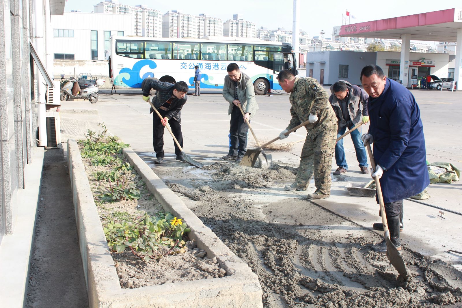 為做好創(chuàng)衛(wèi)工作,確保責(zé)任區(qū)域干凈、整潔及美化工作環(huán)境,12月9日上午,公交東部公司開展公司總站場(chǎng)地面修繕工作。公司副書記寧濘、副經(jīng)理張煒帶領(lǐng)管理人員將公司場(chǎng)站內(nèi)多處破損的水泥地面重新修補(bǔ)平整。由于缺少相關(guān)材料和工具,大家獻(xiàn)計(jì)獻(xiàn)策、分工合作,有的攪拌水泥、有的用抹子將水泥面抹平……整個(gè)過(guò)程進(jìn)展很順利,地面修繕效果較好。