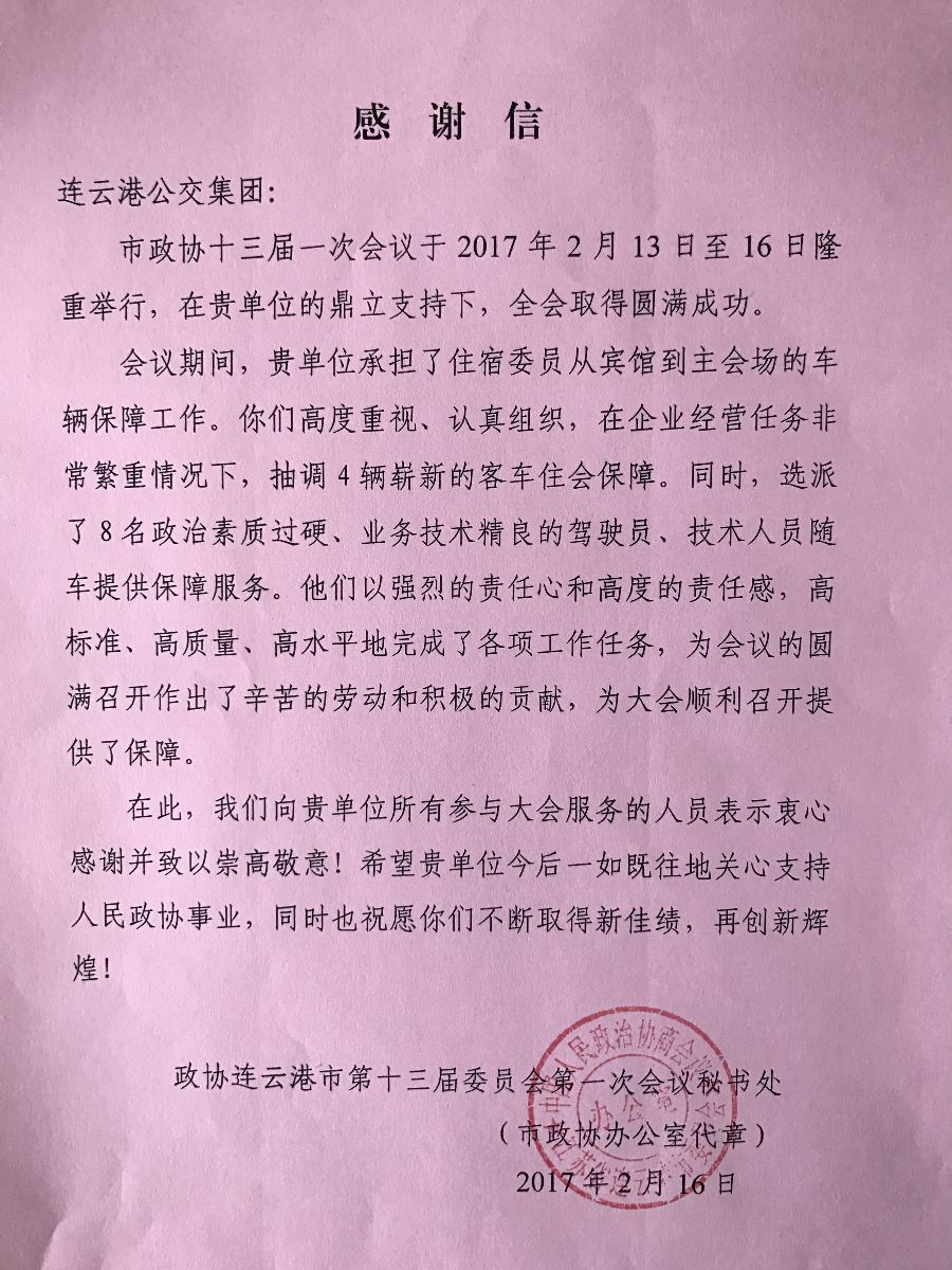 來源:綜合辦公室 作者:倪子棠 2月20日,市政協(xié)秘書長劉玉君、副秘書長張孝昌等相關(guān)人員來到公交集團(tuán),對公交集團(tuán)圓滿完成兩會期間交通運(yùn)輸保障工作給予了充分肯定,并向辛苦付出的駕駛員和工作人員致以感謝和慰問,并致以感謝信。 2017年2月13日—16日,我市隆重舉行市政協(xié)十三屆、市人大十四屆一次會議,公交集團(tuán)承擔(dān)了兩會期間住宿委員從賓館到主會場的車輛保障工作。公交集團(tuán)高度重視、召開專題會議,周密安排,認(rèn)真落實,抽調(diào)20輛嶄新的客車住會保障,選派政治素質(zhì)過硬、業(yè)務(wù)技術(shù)精良的駕駛員、技術(shù)人員隨車提供保障服務(wù),他們以強(qiáng)烈的責(zé)任心和高度的責(zé)任感,高標(biāo)準(zhǔn)、高質(zhì)量、高水平地完成了工作任務(wù),為會議的圓滿召開做出了辛苦的勞動和積極的貢獻(xiàn),受到了會代表的一致稱贊。