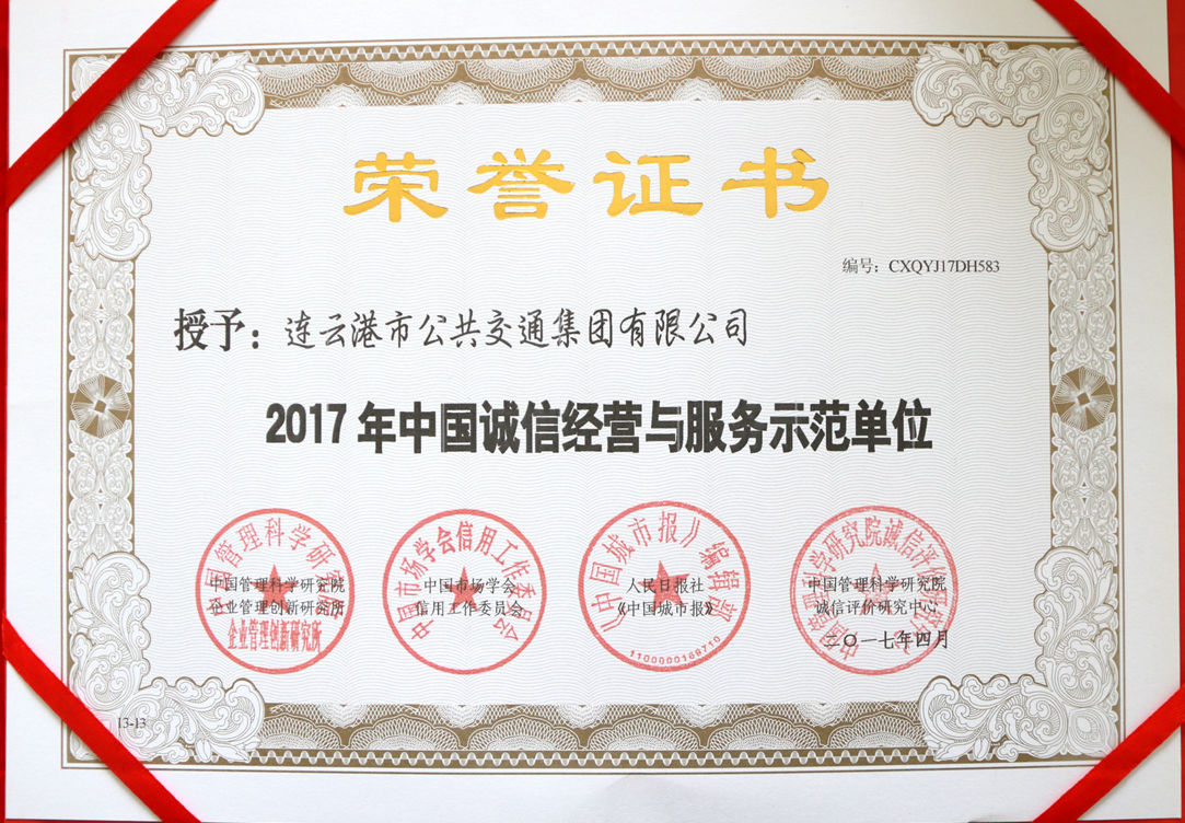 公交集團有限公司作為城市重要窗口行業(yè),多年來一直秉持“服務于民、奉獻社會”的宗旨,始終堅持誠信為本的理念,以誠信、優(yōu)質(zhì)的服務,倡導“誠信服務、真情奉獻、開拓創(chuàng)新、和諧發(fā)展”的企業(yè)精神,在推進良好社會風氣的形成,構(gòu)建和諧社會,傳播精神文明等方面發(fā)揮著重要作用。經(jīng)過前期各個部門的評審、公示、復查等程序,連云港市公交集團榮獲第十四屆“中國誠信經(jīng)營與服務示范單位”殊榮。