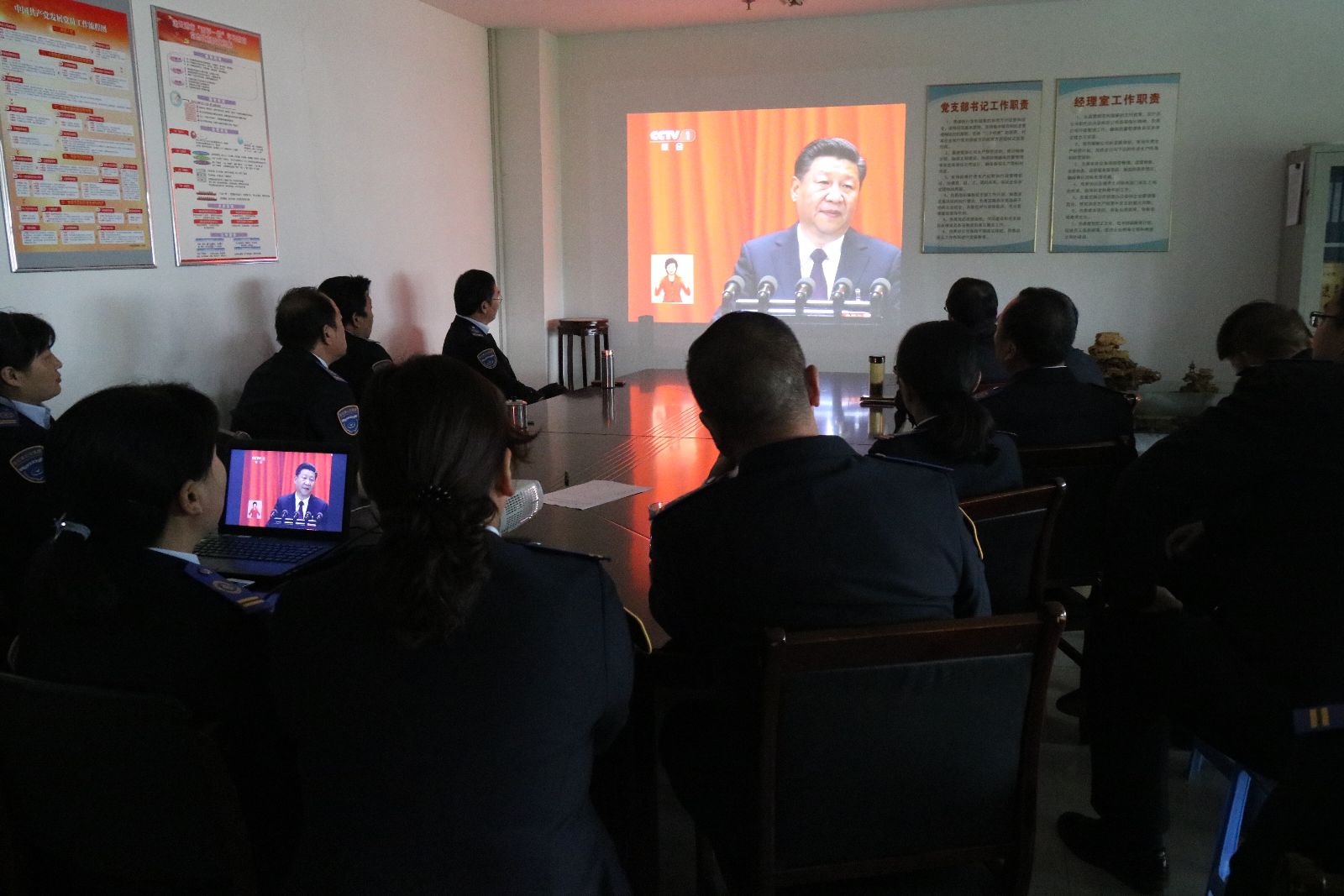 上午8時30分,公交集團(tuán)機(jī)關(guān)黨員干部早早就集中到會議室,提前做好收看準(zhǔn)備工作,全體黨員齊聚一堂認(rèn)真聆聽習(xí)近平總書記代表第十八屆中央委員會向大會所作的報告。