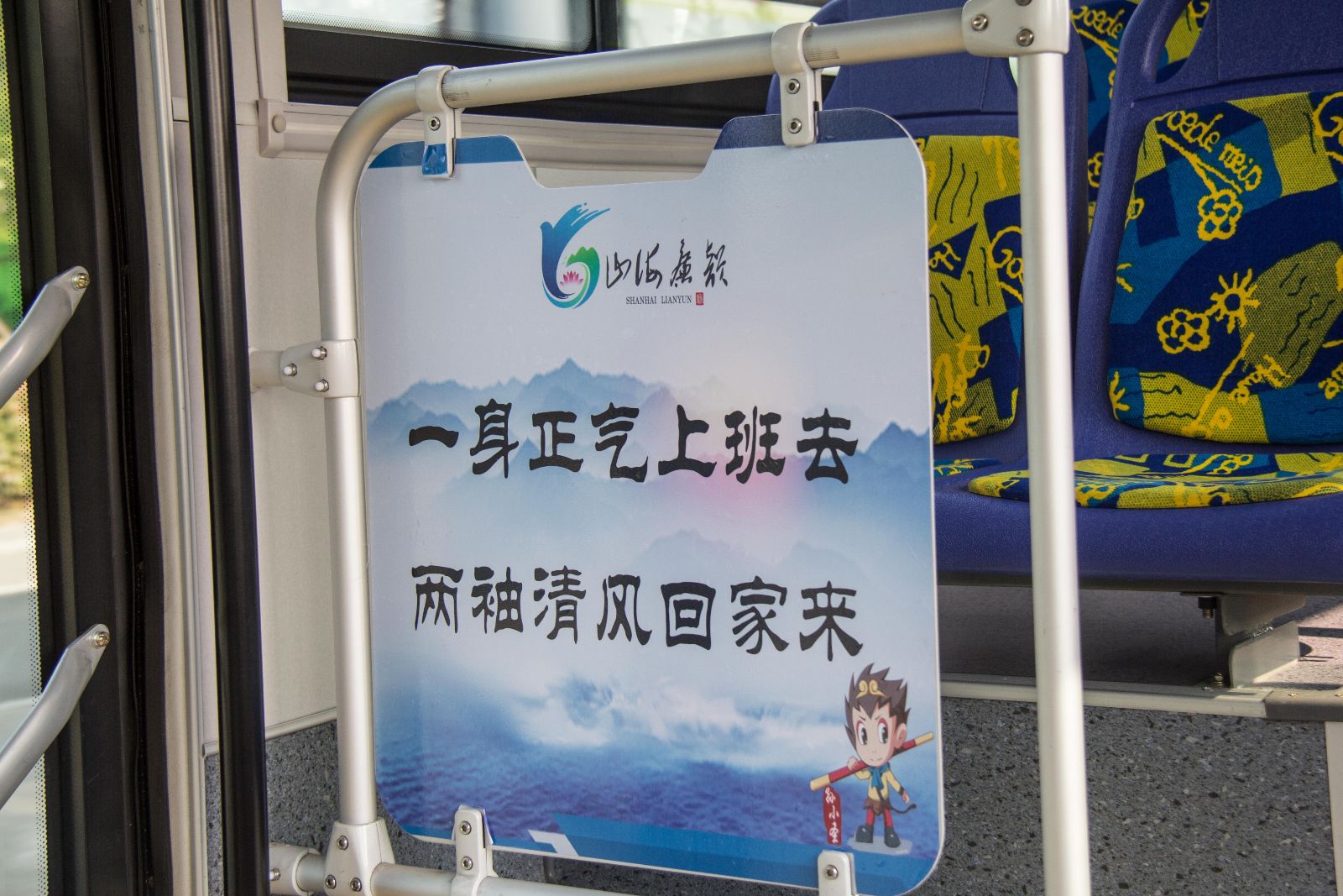 示范車車身外觀以港城的海洋藍(lán)色為主色調(diào),底圖運(yùn)用了連云港山與海的結(jié)合,廉政與文化的交融,寓意廉政文化建設(shè)如同山一樣厚重、海一樣廣闊。寓“廉”于行,故“山海廉韻.與廉同行”。車廂內(nèi),我們將廉政元素與乘車規(guī)則相結(jié)合,形成通俗易懂的格言,讓乘客在乘車途中感受廉政文化的洗禮,獲得思想上的熏陶,強(qiáng)化群眾監(jiān)督,共建廉潔港城。