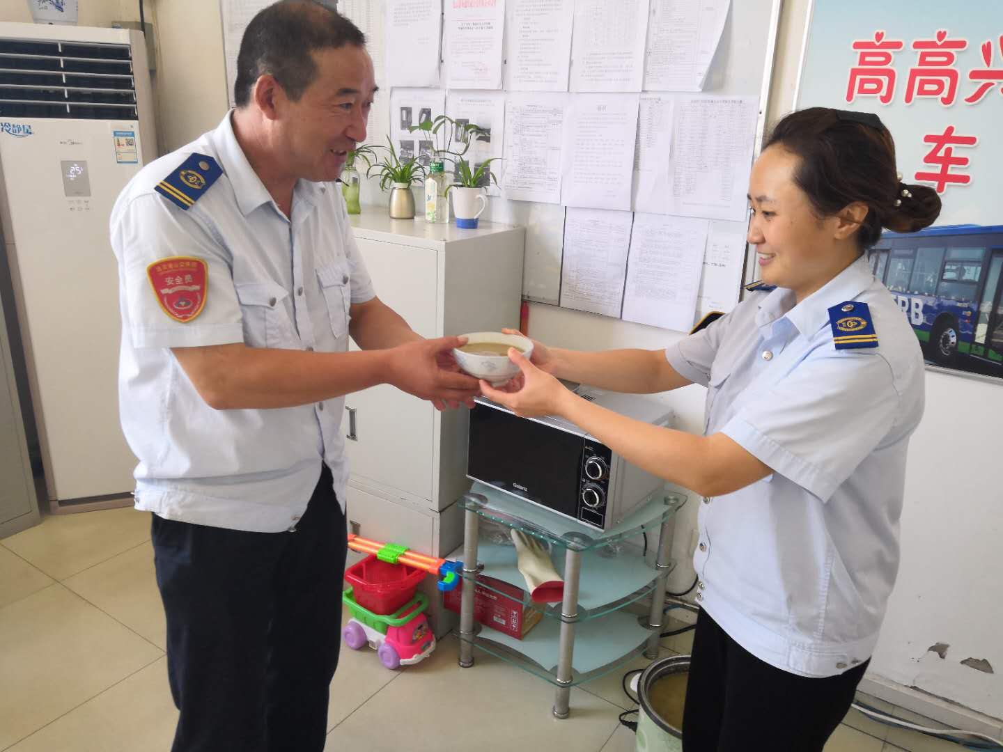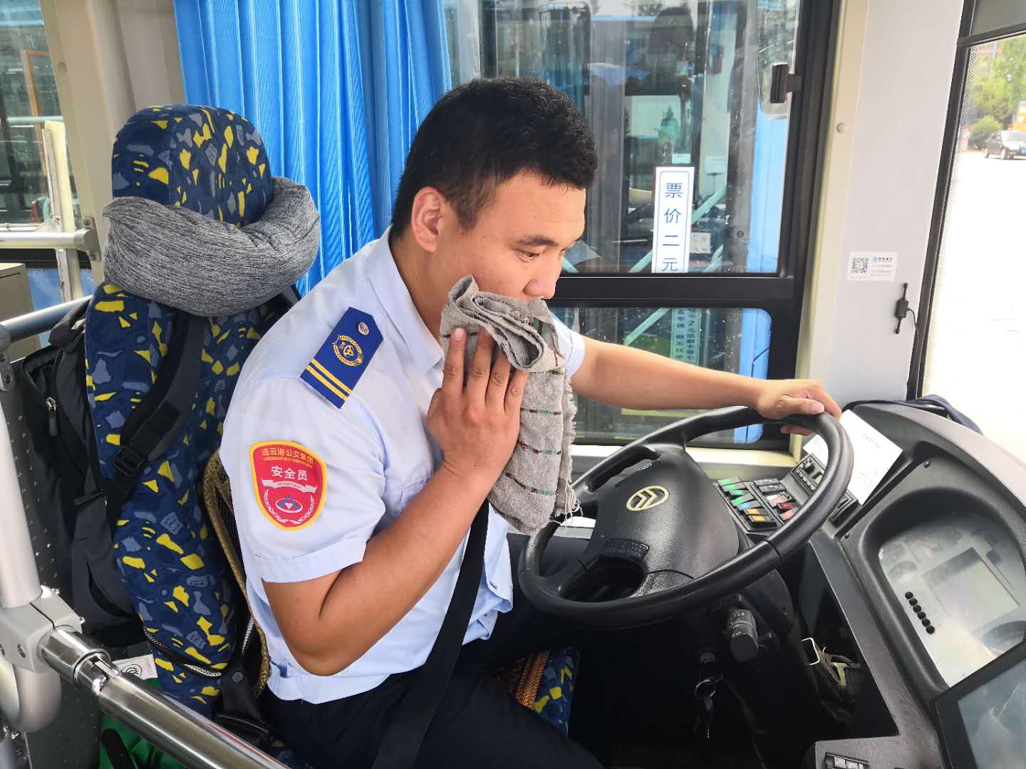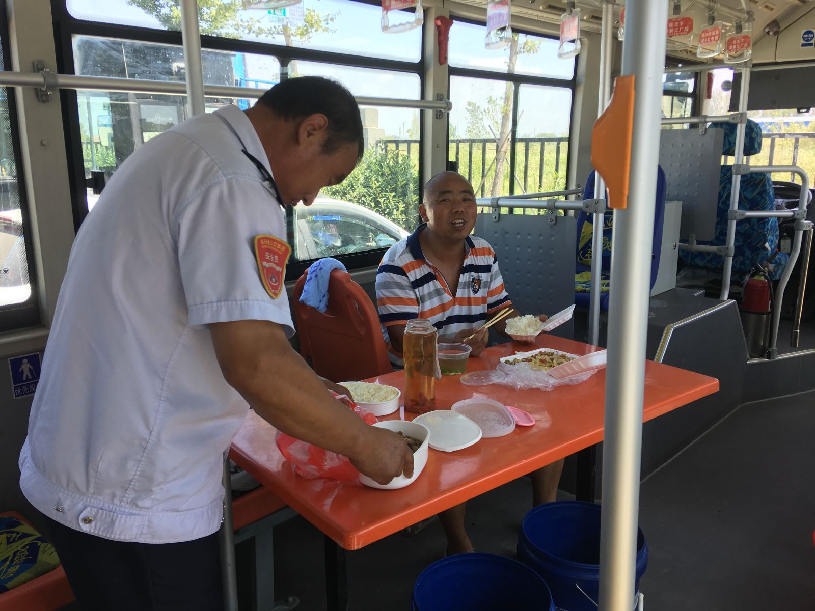 即使是在高溫天氣,為了保證市民乘客的日常出行,港城的公交人們?nèi)淌苤邷乜崾钜琅f堅守崗位,默默地?fù)]灑著汗水。公交集團(tuán)海通公交公司為切實踐行“分公司為一線駕駛員服務(wù)”的服務(wù)理念,各分公司實行輪流值班制,在線路車輛密集的西城公交停車場,上午10:30左右,公司安排一輛電動車停放場內(nèi),車上擺放了簡易餐桌和飲用水供駕駛員休息、吃飯使用。