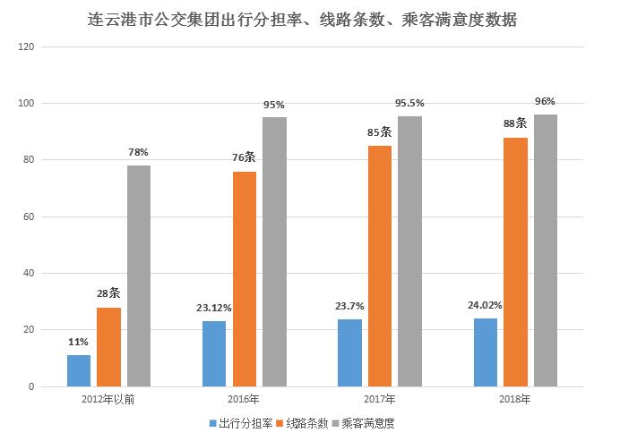 2012年之前,我市運營公交線路僅有28條,車輛數(shù)370臺,社會承包車占比70%,車輛空調(diào)化率為23.7%,日均客流量為13.29萬人次,出行分擔率為11%,社會滿意率僅為78%。經(jīng)過六年精心耕作,公交發(fā)展指標得到大幅提升。