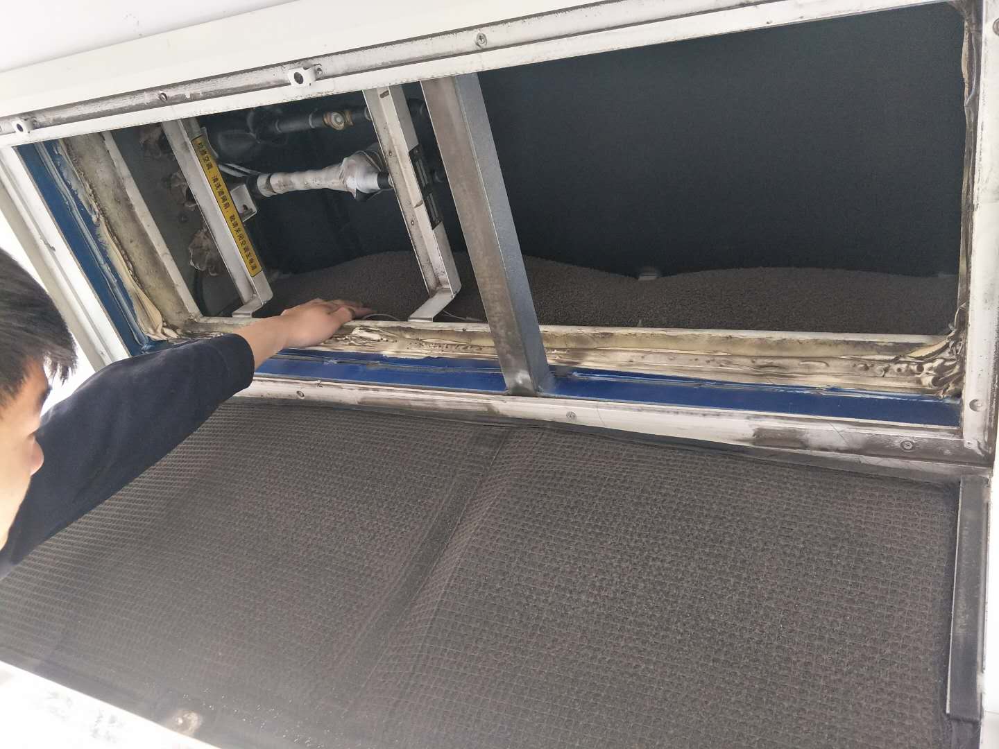 6.使用并站在手扶梯上,查看冷凝風(fēng)機(jī)是否完好無損,檢查冷凝器蓋子過濾網(wǎng)是否有雜物,如果有雜物需要及時(shí)清除。(純電動(dòng)車通用)
