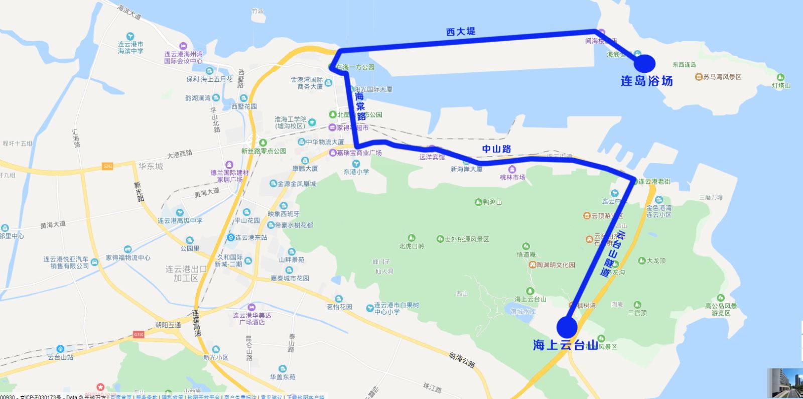 2、途經(jīng)站點:海上云臺山、連云古鎮(zhèn)、新海岸大廈、墟溝火車站、陽光國際、在海一方公園、金海國際、連島浴場