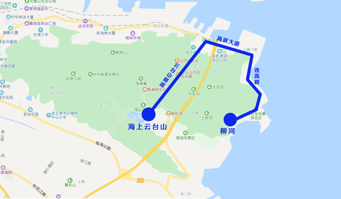 1、線路走向:海上云臺山—云臺山隧道—海濱大道—連高路—柳河