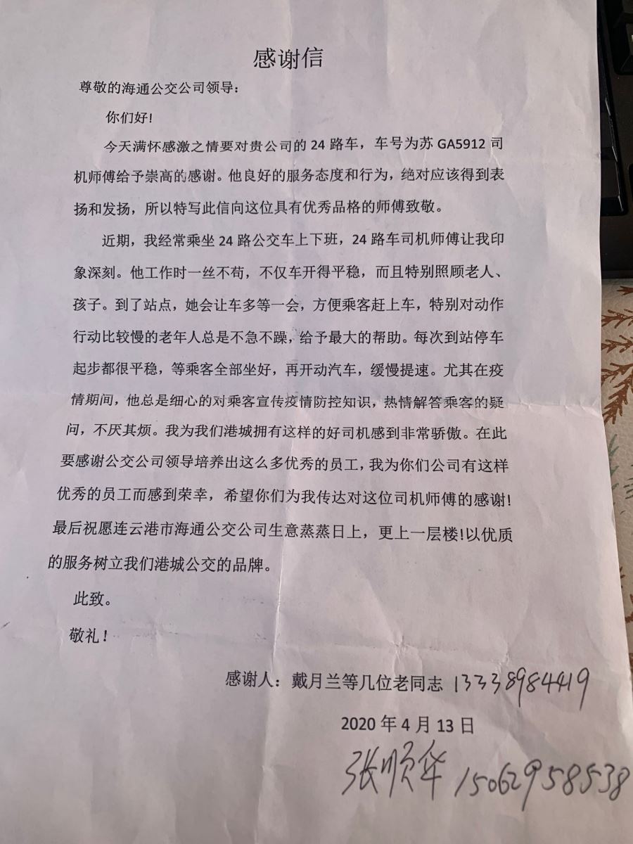 信中,戴女士表示她經(jīng)常乘坐24路公交車(chē)上下班,徐剛師傅讓她印象十分深刻,他不僅車(chē)開(kāi)的平穩(wěn),而且對(duì)待老人、孩童的態(tài)度也非常和藹。每當(dāng)看見(jiàn)行動(dòng)較慢的老人往站點(diǎn)趕時(shí),徐師傅總是不急不躁,耐心等候,攙扶老人上車(chē),直到老人坐穩(wěn)才駕車(chē)駛離站點(diǎn);每當(dāng)遇到放學(xué)的學(xué)生乘車(chē)時(shí),他總是提醒車(chē)內(nèi)乘客給孩子讓個(gè)座。疫情期間,徐師傅細(xì)心的為乘客宣傳疫情防控知識(shí),熱心解答乘客的疑問(wèn),不厭其煩。戴女士為港城能擁有這樣的好駕駛員感到驕傲。
