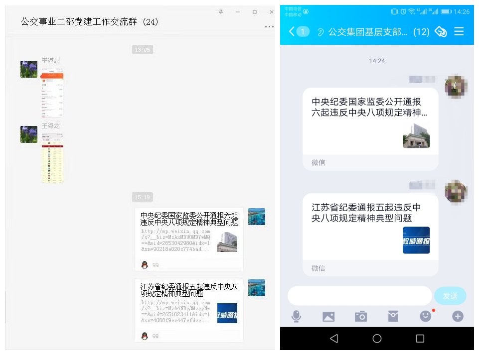 三是加強廉潔教育提醒,通過QQ、微信工作群發(fā)送廉潔提醒、轉(zhuǎn)發(fā)中央省市紀委關(guān)于違反中央八項規(guī)定精神典型問題通報,提醒全體黨員干部加強黨性修養(yǎng),增強廉潔從業(yè)和自我約束能力,筑牢節(jié)日期間廉潔自律思想防線。